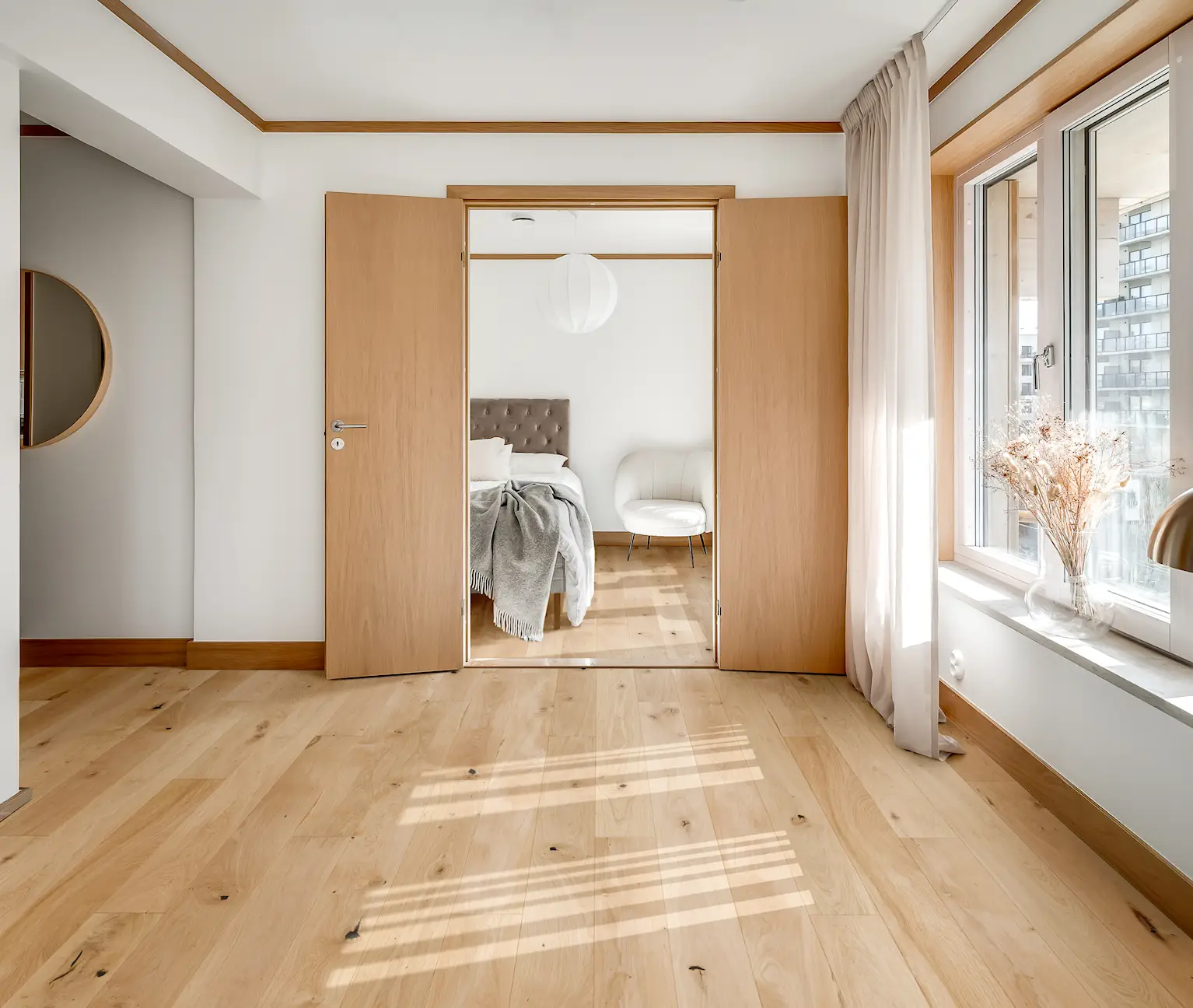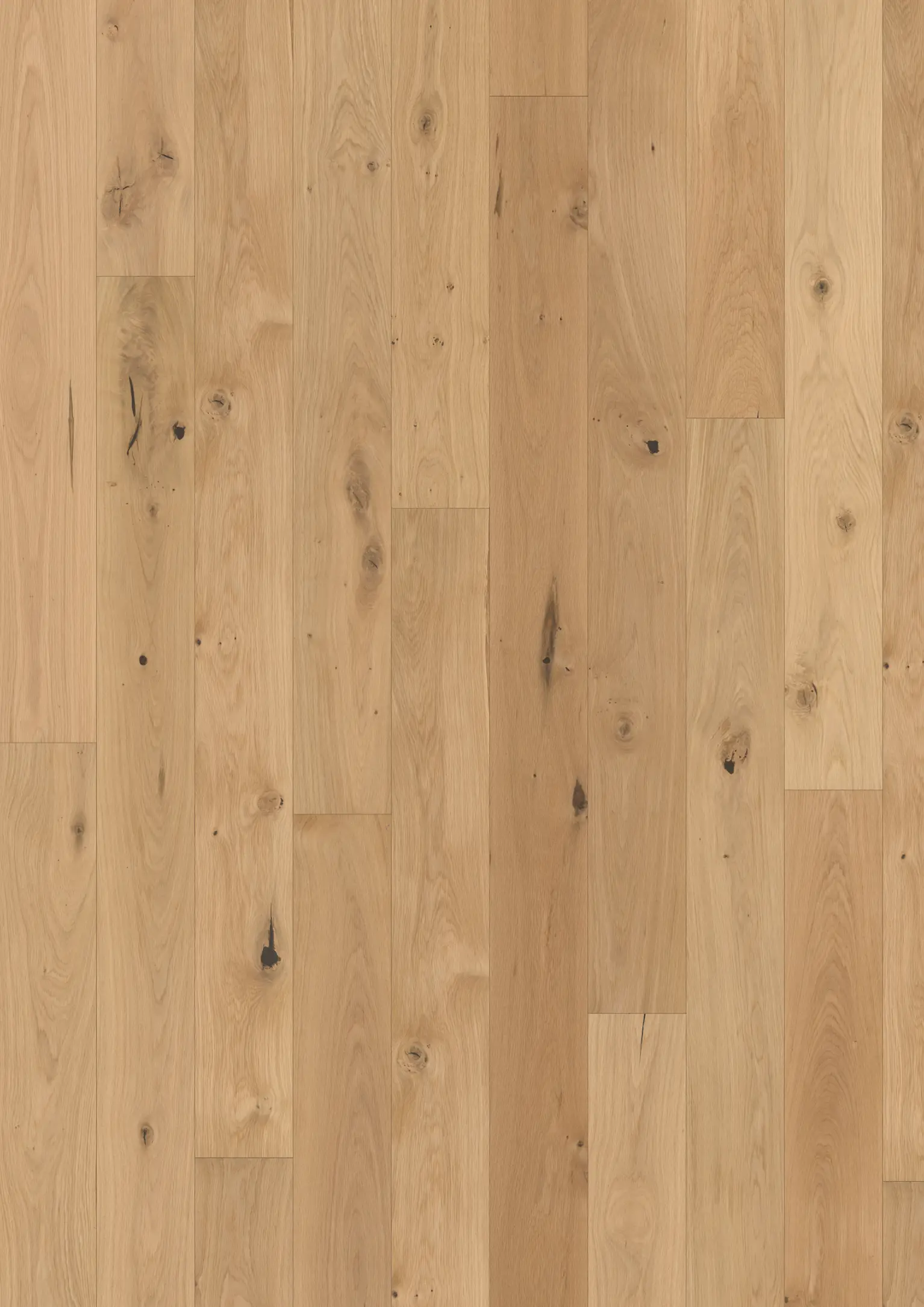 Oak Iris features a light white wash with a subtle rohoptic nuance that harmonizes darker wood grains, knots, and natural cracks. The narrow planks enhance the floor’s elegant and modern character, while the brushed, matt lacquered surface highlights the natural texture of the oak, allowing nature’s patterns to stand out beautifully.
