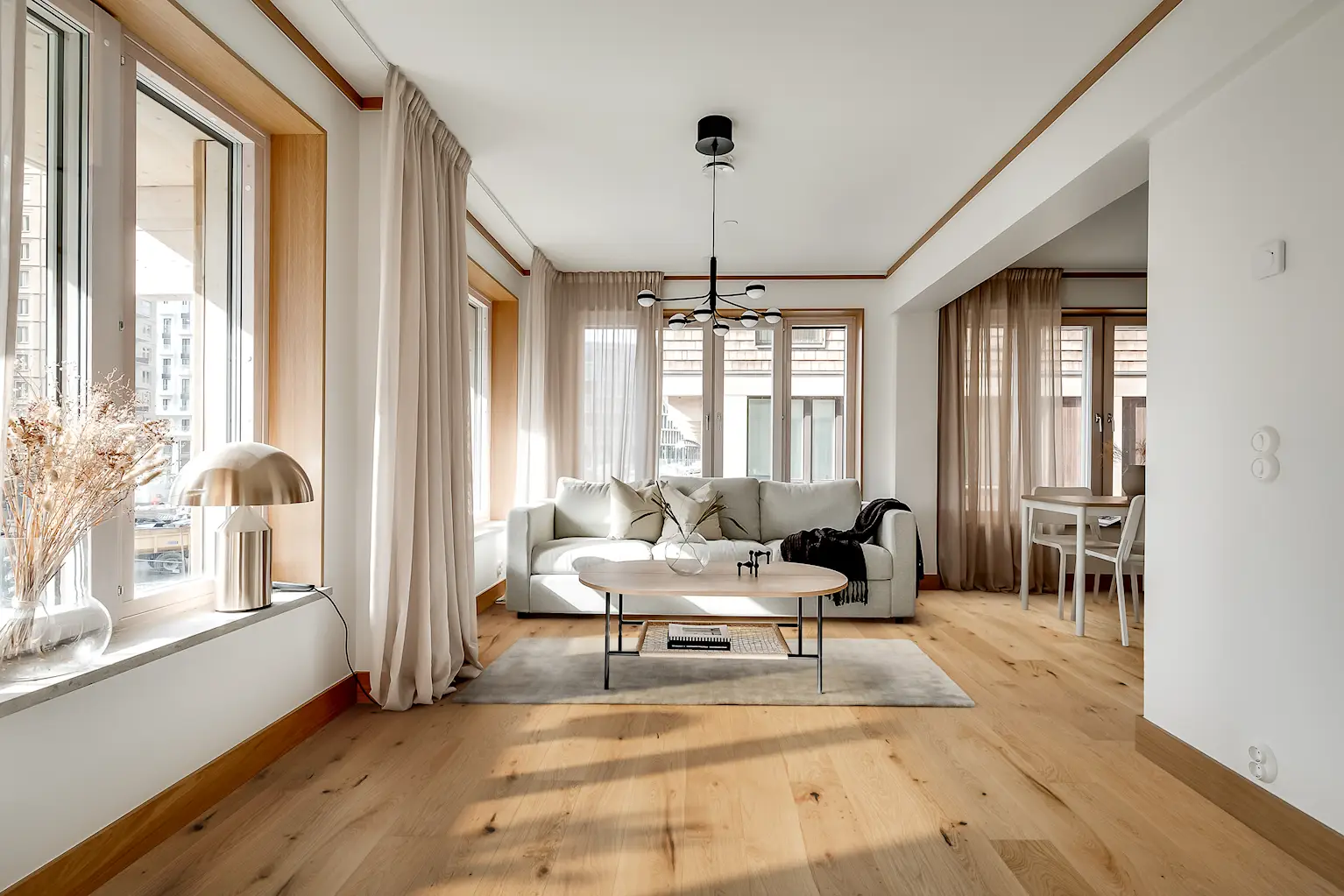 Oak Tulip is a natural oak floor with a modern, softly muted look. The 151 mm wide board enhances its refined character, while the brushed, ultra-matt lacquered surface complements the natural wood grain of each board to create a subtle, elegant look and tactile impression.